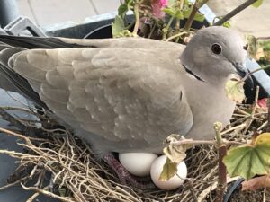 Meneer en mevrouw Duif voelden zich zo veilig bij ons, dat ze binnen een week een nest aan het maken zijn in de plantenbak die aan het Frans balkon hangt, bij de slaapkamer van mijn 5-jarige dochter. Nog geen week later ligt het eerste ei erin en twee dagen later ook het tweede ei. Mevrouw Duif is nog een beetje schichtig naar ons, maar dat verandert al snel. Ze went aan onze geluiden en mijn dochter zingt iedere avond hetzelfde liedje voor mevrouw Duif. Al snel kunnen we één van de balkondeuren rustig opendoen, zonder dat ze wegvliegt. Dit levert prachtige foto’s op. Iedere dag leggen we vast.